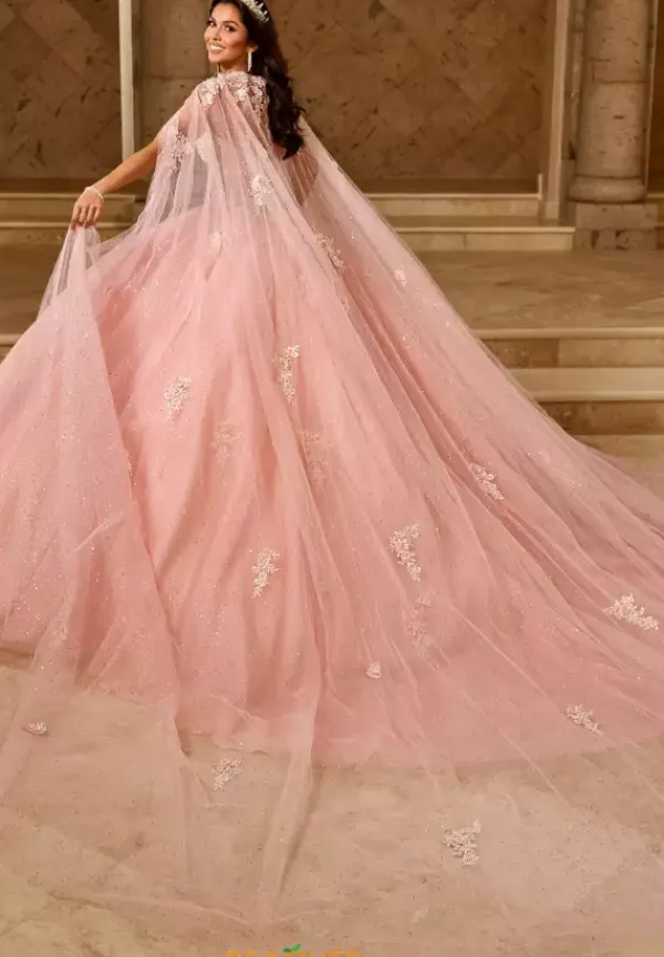 Bring the glamorous drama to your quince dress with this cape from Rachel Allan Quince style QS1162. This long flowing glitter tulle cape attaches with a collar at the front of your neck while the tulle falls. The shoulders and neckline are adorn with gorgeous appliques. This is the cape only and the dress is sold separately from Rachel Allan Quince style RQ112.