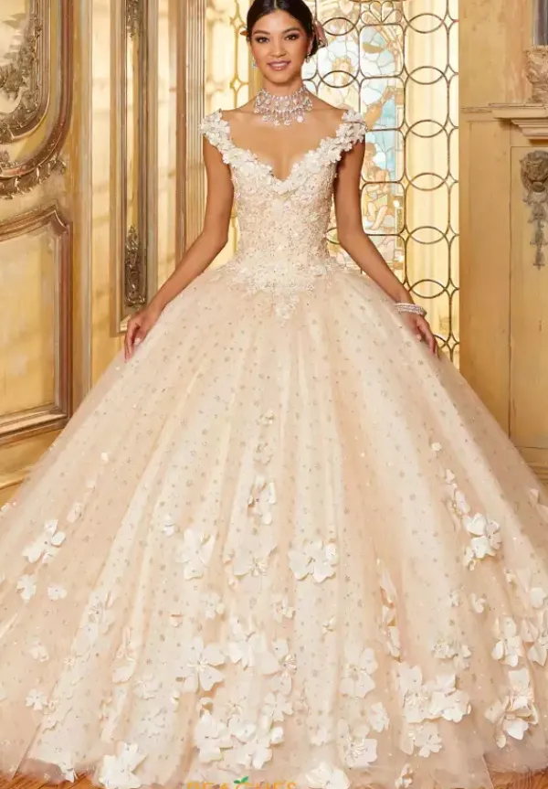 Lovely ball gown dress 34063 by Vizcaya is absolutely breathtaking. This stunning bodice is adorn in three dimensional flowers that trim the off the shoulder sweetheart neckline. The full tulle layered skirt cascades those flowers down the bottom of the skirt with sparkling rhinestone beadwork throughout the tulle. Matching shawl included.