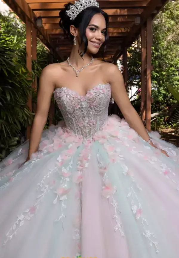 Feel like a true princess in this stunning Vizcaya ball gown style 4080001. The multi color tulle dress has a detachable off the shoulder cap sleeves sweetheart neckline with a gorgeous detachable back bow. The bodice is bejeweled with sparkling beadwork and three dimensional flowers that continue onto the top of the skirt.