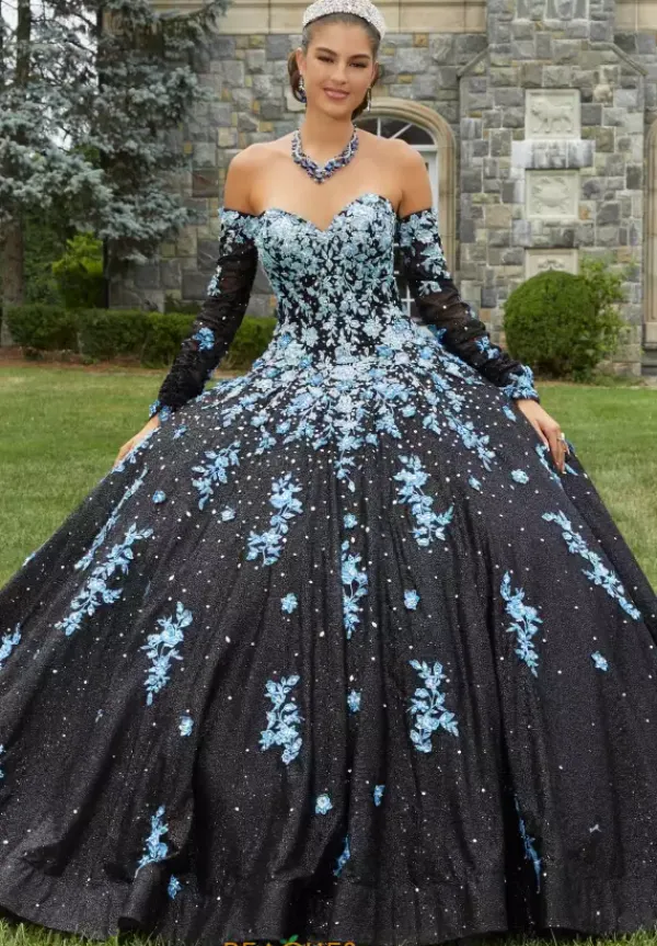 Dance the night away in jaw dropping ball gown 89415 by Vizcaya. The corset bodice is complimented by a sweetheart neckline and is fully adorned in contrasting beaded and embroidered details that make a gorgeous transition onto the voluminous glittering tulle skirt. The back of this dress displays a traditional lace up closure, sweep train, and detachable bow.