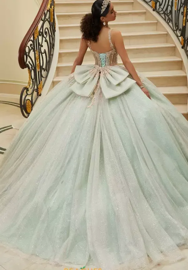 Feel like a modern day princess in this enchanting one of a kind Quinceanera dress by Vizcaya, style 89471. Showcasing a stunning beaded corset top that leads down to the sparkly full skirt. This princess ball gown is adorned with a beautiful sparkly detachable bow. The sweetheart neckline enhances the floral beading paired with the straps. Finish the look with a matching bolero jacket.