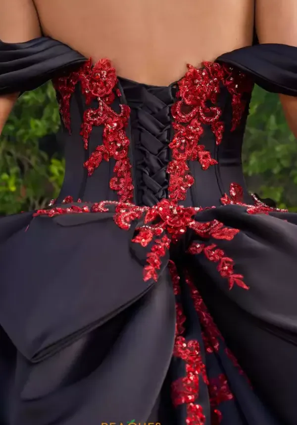 Fill the night with countless memories in this enchanting ballgown by Vizcaya Quinceanera, style 89544. This timeless dress features detachable off-the-shoulder satin draped sleeves into a sweetheart neckline. The bodice is beautifully embroidered with flowery detail that cascade into the satin layer with that embroidery at the edges. The glitter tulle skirt opens at the middle by the top satin layer creating an alluring look. A matching detachable bow drops just as long as the glitter tulle that will make your exit feel unforgettable.