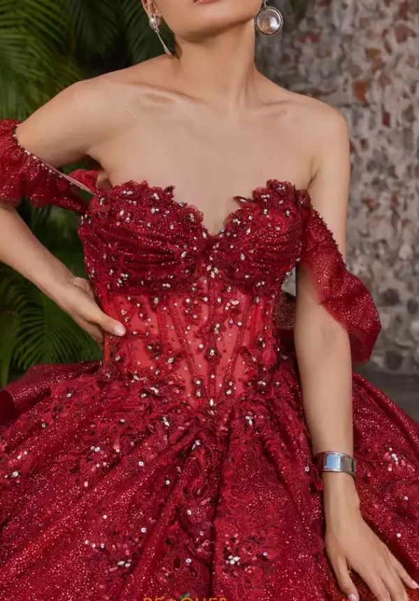 Turn your special night into an unforgettable dream in this dazzling Vizcaya Quinceanera dress, style 89555. This radiant ballgown features a glittering bodice adorned with detailed applique that flows seamlessly into a shimmering tulle skirt. The structured corset sparkles with delicate beadwork, adding extra brilliance to every movement. A detachable glitter train and a statement making, oversized bow that stretches across the back, making you glow with every step you take. It’s the perfect gown for a night filled with sparkle, magic, and memories that last forever.
