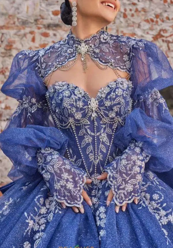 Be the spotlight of the night in this truly captivating ballgown by Vizcaya Quinceanera, style 89563. Featuring a endearing sweetheart neckline with off-the-shoulder straps exuding elegance. Bold beading paired with intricate applique adorns the corset and flows seamlessly into the long glitter tulle train. Completing the look, a dramatic bow cascades to match the length of the train. For an unforgettable entrance, a detachable high collar with scalloped detailing adds a regal touch that’s sure to leave everyone in awe as they see you.