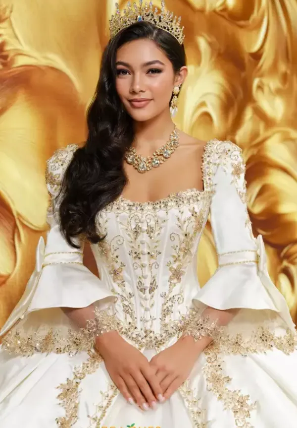 Feel like royalty in this Princesa Quinceañera gown, style PR30210. This elegant and one of a kind dress features detachable off the shoulder straps, offering both versatility and comfort. The intricately detailed bodice is designed to turn heads, enhanced by a unique corset style jacket that makes this gown truly unforgettable.A built in corset with a lace up back ensures the perfect fit, complete with a modesty panel for added elegance and coverage. The full tulle skirt is richly adorned with applique, beading, glitter, and satin, creating a breathtaking look from every angle.For a final show stopping touch, the gown includes a detachable bow. Not only is this dress stunning, but it’s also practical—with hidden pockets seamlessly tucked into the design for added convenience. This gown includes a breathtaking Princesa logo necklace completing the whole look.