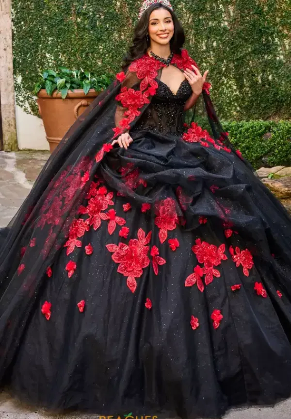 Stop the show upon your entrance in the extravagant quinceanera dress style RQ1144 Rachel Allan Quince. Featuring the illusion bodice that is loving adorned with meticulous beadwork and is enclosed with a full corset lace back. The full tulle skirt is complimented with ruffles and intricate floral appliques. Long cape sold separately as QS1144.