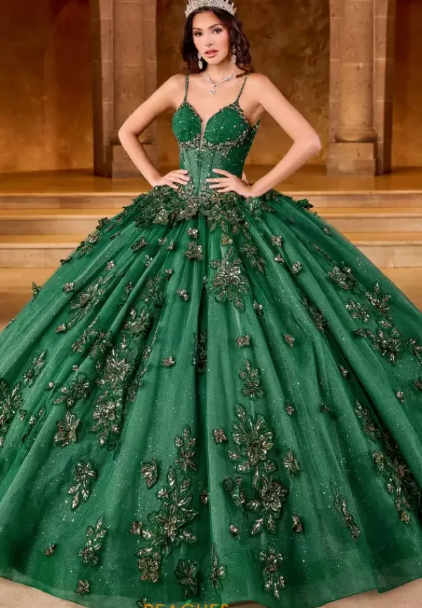 Be the talk of the season showing up in the classy Quinceanera dressstyle RQ1149 by Rachel Quince. The lovely illusion bodice is adorned in intricate beadwork that is displayed all over the corset. The full tulle skirt is decorated with three dimensional floral applique and cascades down to the very end of the fly away train.