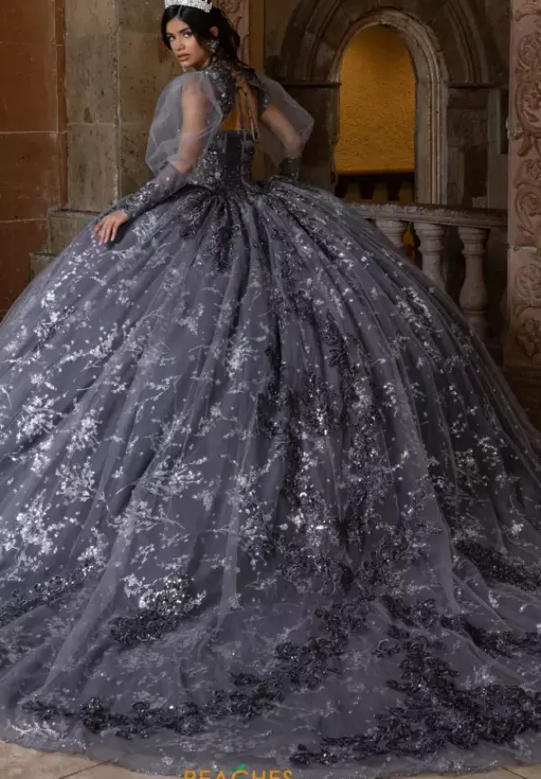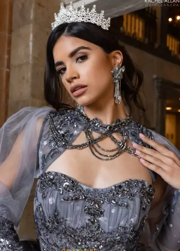 All eyes will be on you when you enter your Quinceanera in this Rachel Allan Quince dress style RQ1172. This long waisted bodice has a sheer illusion waist line with exposed boning that comes with a detachable bodice liner. The strapless scoop neckline has detachable long pouf sleeves with hanging bead work. The full ball gown skirt is made from glitter tulle.