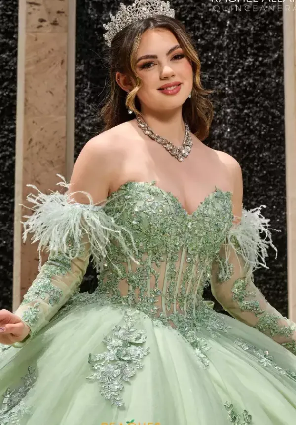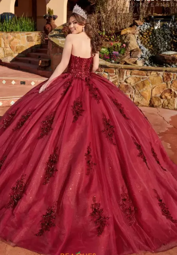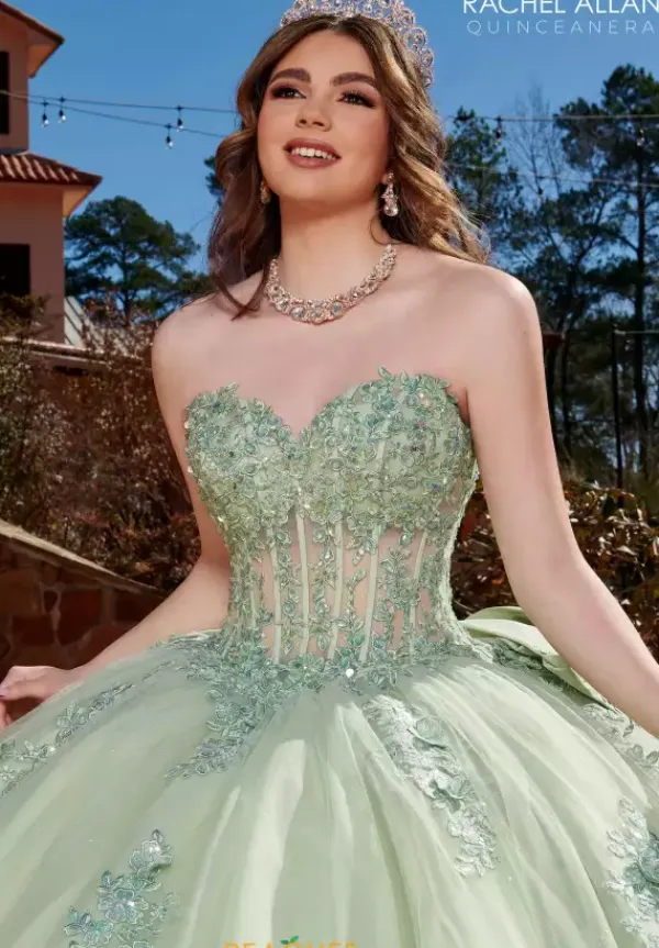Be memorable in unforgettable dress RQ2171 by Rachel Allan. Stunning from top to bottom, this dress flaunts a classic corset bodice complemented by a strapless off the shoulder neckline fully adorned in radiant beadwork that makes a stunning transition onto the top of the voluminous skirt where stunning appliques are featured. An oversized bow sits beneath the lace up closure giving you a remarkable finish.