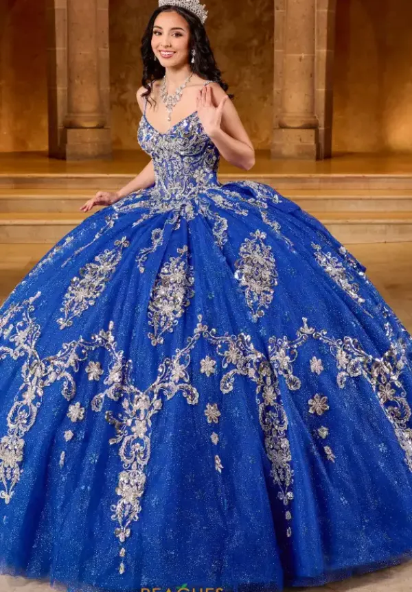 Feel like royalty in this stunning Rachel Allan Quince dress style RQ2202. This ball gown has a sunning long waisted bodice with a corset lace up in the back for a snug fit. A gorgeous bow decks the back of the ball gown with a long flowing train. Metallic appliques are scattered throughout the dress.