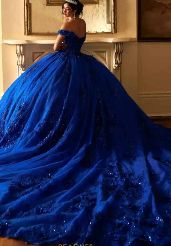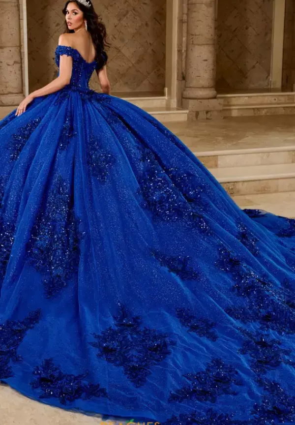 Feel regal and grand in this gorgeous sparkling ball gown from Rachel Allan Quinceanera style RQ2215. Available in bold statement colors, this dress features an off the shoulder cap sleeve neckline. The bodice is bedazzles with sparkling glitter and sequins appliques over exposed boning of the corset. The full ball gown tulle skirt continues those matching appliques all along the hem line and the long flowing train.