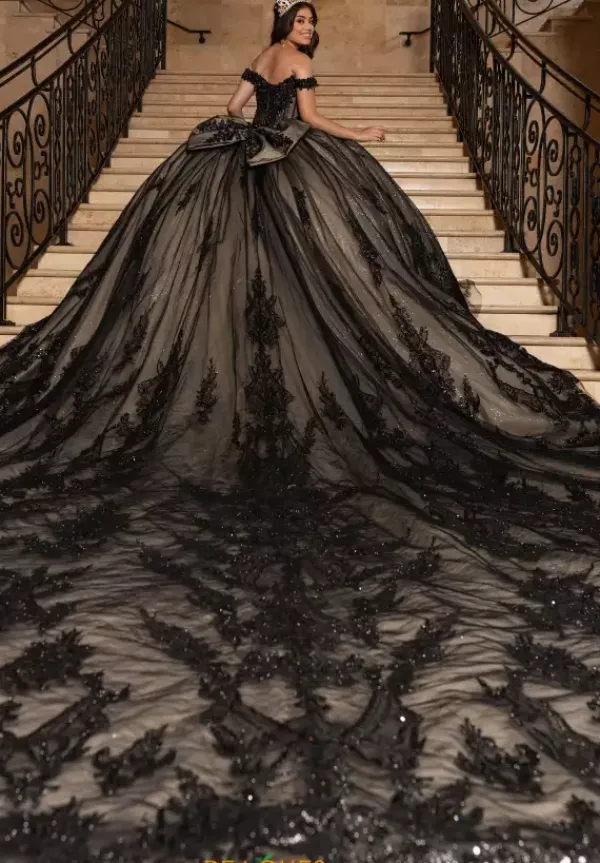 Be untouchable in this striking and glistening Rachel Allan Quince ball gown style RQ2247. Dazzling mixtures of beads, sequins, and appliques shimmer across the glittering tulle fabric of the adjustable corset bodice and dramatic cathedral style sweep train skirt. Intricate patterns decorate the hem and match the detachable bow.