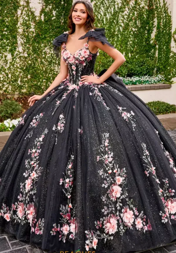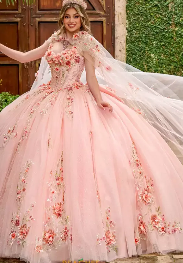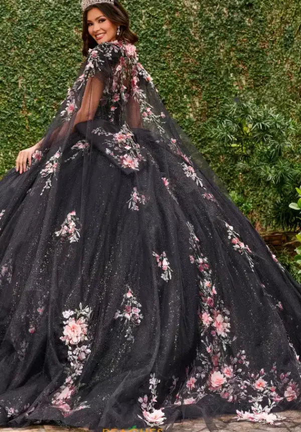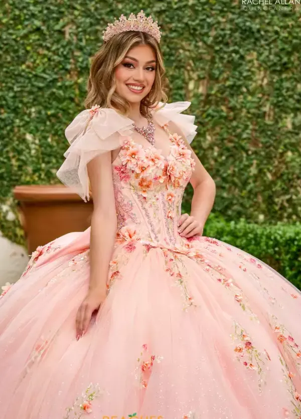 All eyes will be on you when you enter your quince in this jaw dropping Rachel Allan Quince dress style RQ3132. The contrasting detailing make this dress pop with three dimensional flower details that adorn the sweetheart bodice. Bow tied straps make the big bow int he back of the dress. Full tulle gives the ball gown the perfect princess effect. Cape sold separately as QS3132.