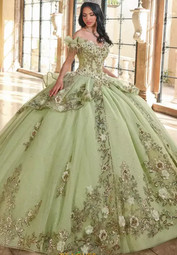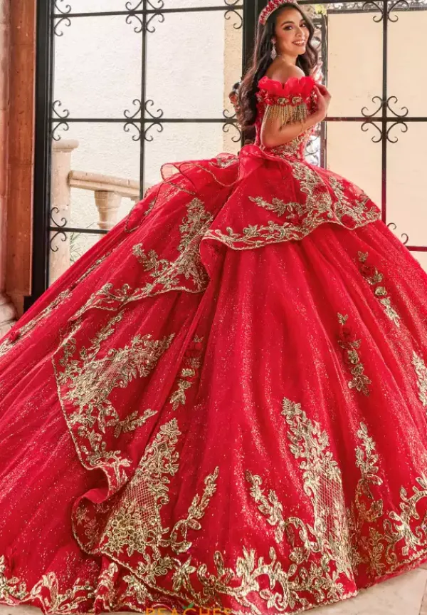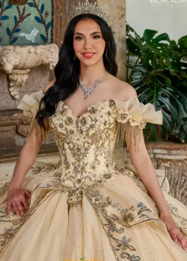 Have all eyes on you in this stunning ball gown by Rachel Allan quince RQ3137. Featuring a classy off the shoulder neckline with a cap sleeve detailed with a fringe for a unique look. Made in a glamorous tulle adorned with a floral appliques and beadwork for an eye catching look. A long dramatic train is added to complete the look.
