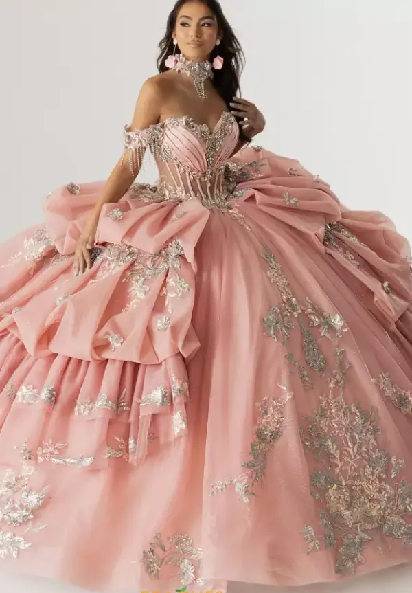 Make a statement this season in ball gown style RQ6014 by Rachel Allan Quince. The off the shoulder sweetheart neckline is paired with the lovely illusion bodice embellished with lace sequin applique and a delicate line of beaded fringe. Showcasing the multi tiered glittered tulle skirt embellished with applique meticulously along the trim of each layer and finishes with a delicate scalloped train.