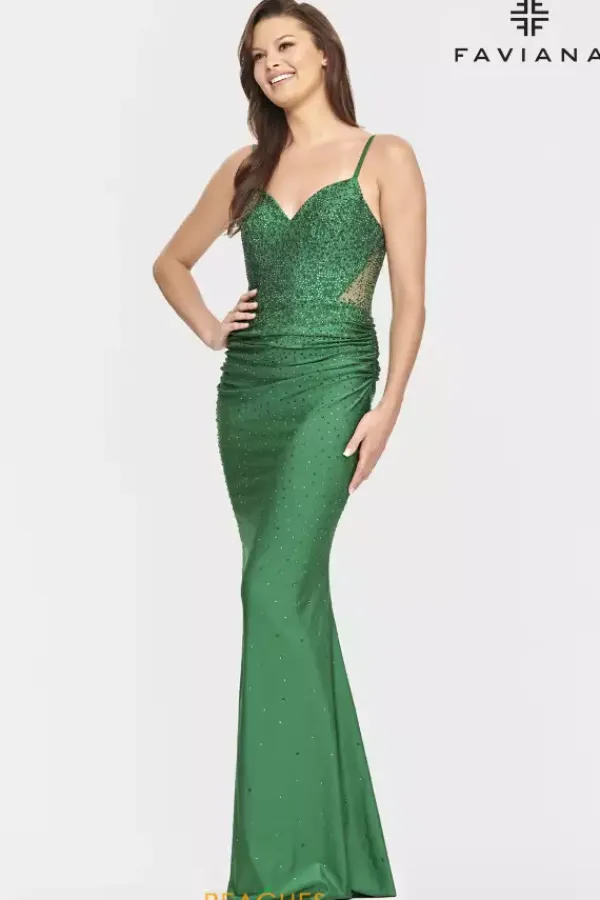 Sparkle from all angles in this fitted charmeuse Faviana dress style S10800. Available in bold, rich colors, this dress is fully adorn from the bodice and trickles down to the hem with hot stone rhinestones. The v neckline and thin shoulder straps that connect to the sheer illusion back. Gather in and ruching make this dress ultra flattering.