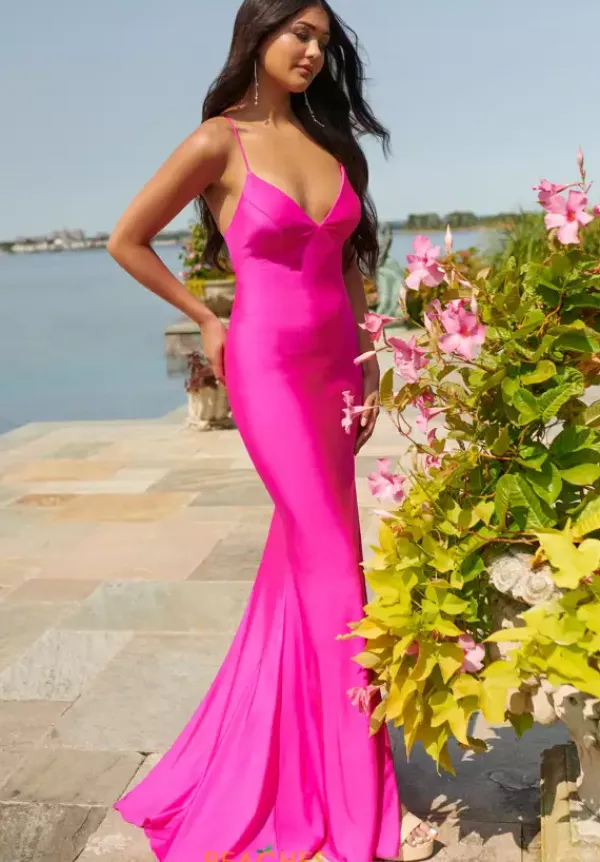 This sought after Faviana fitted long dress S10826 is flattering and available in the hottest colors! This sleek charmeuse dress has an adjustable bodice that hugs the small of your waist and the skirt features a classic sweep train that gracefully follows behind you. Ruching is featured on the zip up closure for a flattering 3D effect.