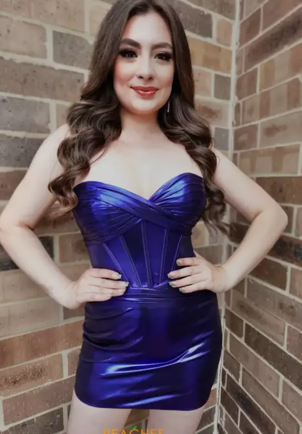 Become the center of attention when wearing this Sherri Hill short dress, style 56778. This ensemble is made out of lame material, showcasing a strapless sweetheart neckline leading to a back zipper. The top of this dress has a corset that will for sure hug your waist beautifully. Meanwhile, the skirt is classy but yet with some rushing in the middle.