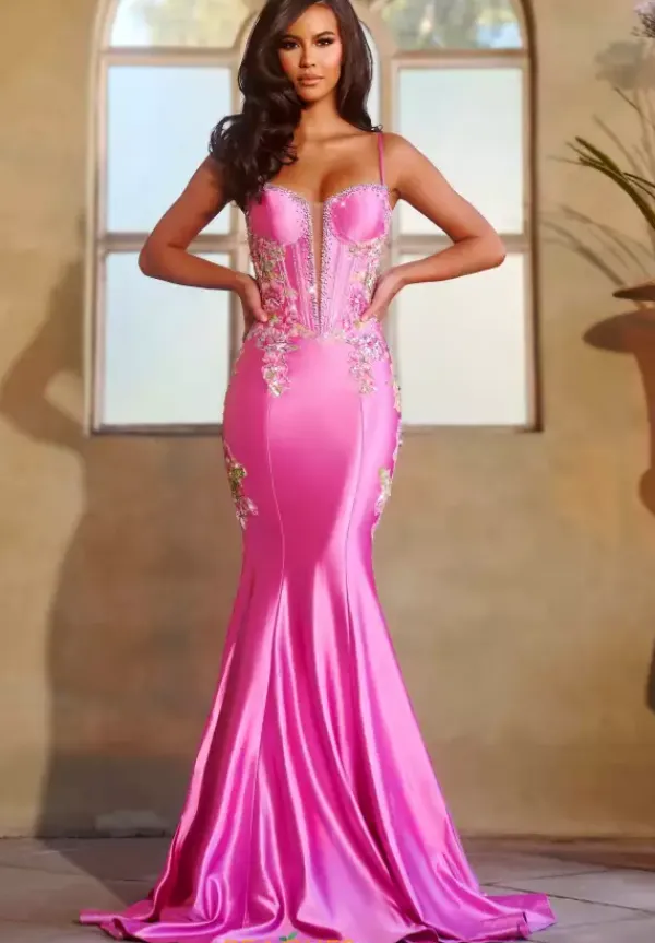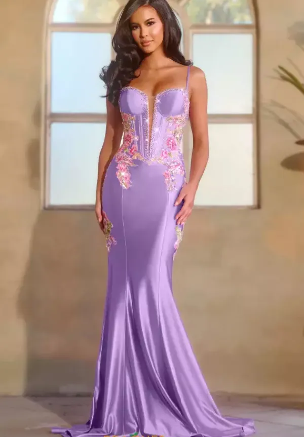 Radiate your dazzling energy in this show stopping long fitted gown by Starielle style number STR64. This captivating dress features a classic V shaped neckline with thin straps for support and a structured corset bodice with exposed boning that will accentuate your figure flawlessly. The bodice and sides are embellished with gorgeous floral applique and sparkling beadwork.