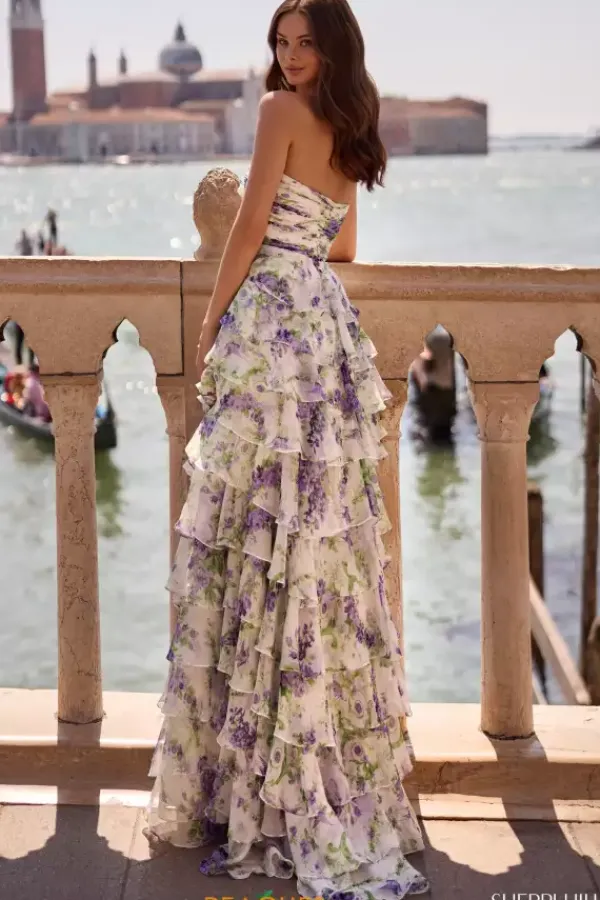 Float away on to the dance floor at your prom in this all over chiffon Sherri Hill dress 57613. This printed one of a kind a line dress has a strapless sweetheart neckline bodice that is ruched and a tied bow detail in front. The flowing layers of chiffon overlap each other giving it the right amount of fullness.