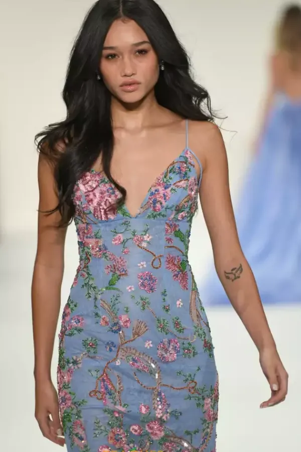 Step into a world of glamor with this captivating Sherri Hill pageant dress style 57670. Amp up your confidence with a cinchable corset back that shrinks your waist while the rest of the fitted silhouette hugs your figure perfectly. Romantic sequin beaded floral embellishments are sewn to perfection all the way down to the sweep train.