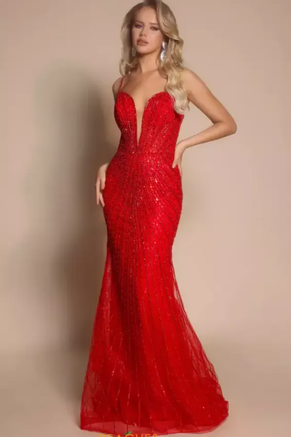 Look like you stepped off of the red carpet in this fierce Portia and Scarlett prom dress style XO019. Glistening stone beads garnish the plunged fitted bodice and cascade onto the no slit long skirt to exude radiance and glamor on top of the glitter tulle fabric. This figure enhancing dress has a zipper closure.