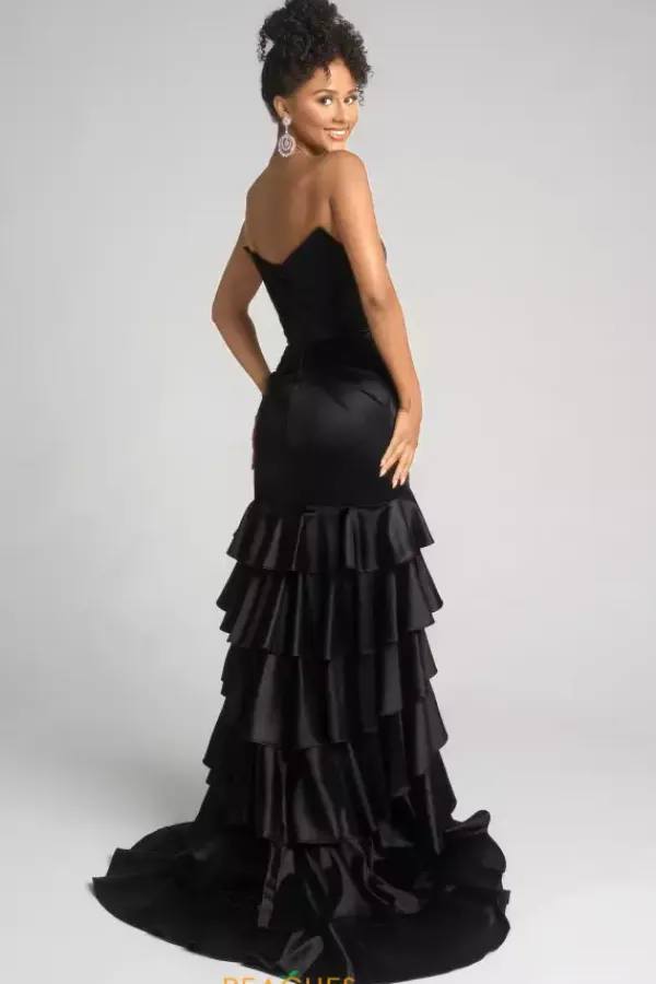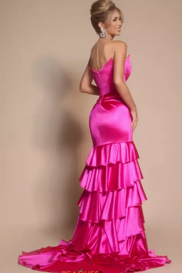 Be the drama in this head turning Portia and Scarlett satin prom dress style XO021. Glamorous from top to bottom, this strapless fitted silhouette displays pleating on the front of the fitted skirt above the frilly multi tiered cascading sweep train. Strut easily with a daring thigh high slit and glowy sweep train.