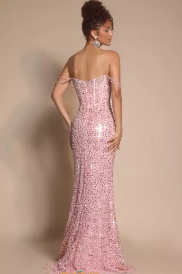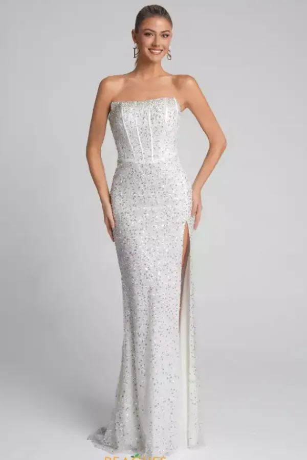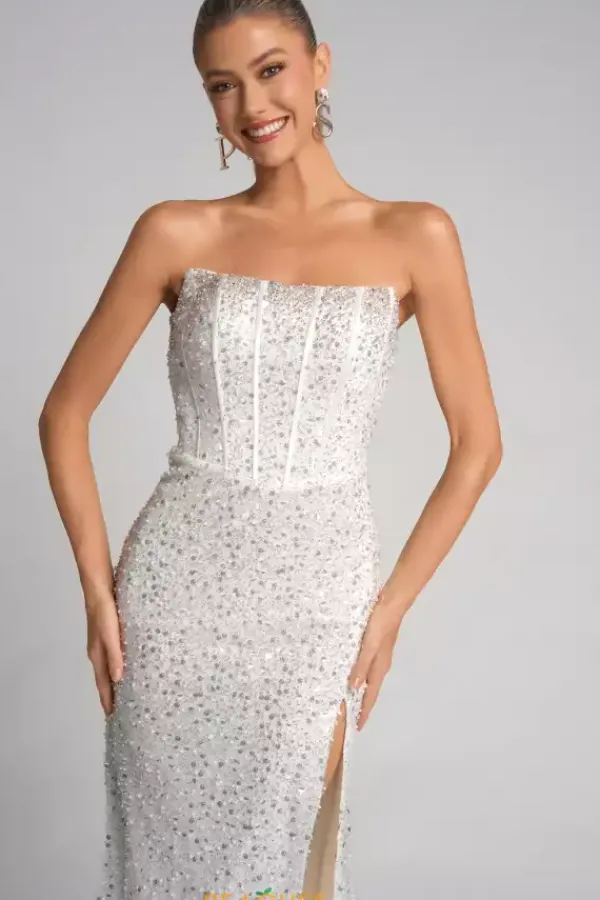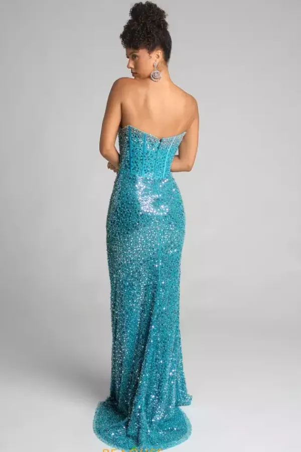 The world revolves around you when you wear this haute Portia and Scarlett prom dress style XO054. Silver beads and sequins adorn the strapless scoop neckline of the overbust corset bodice and seamlessly blend into the color matching combinations of sequins and radiant beads that cascade onto the long skirt.