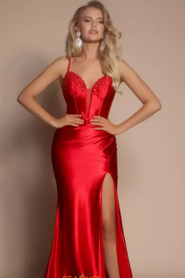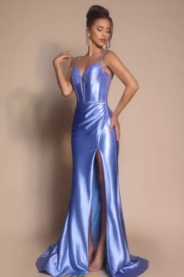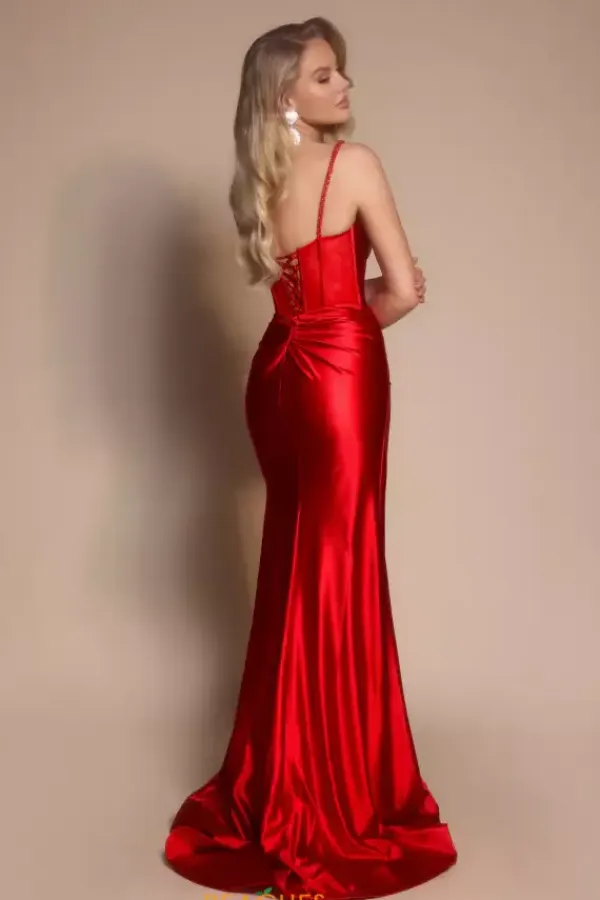 Be the envy of all in this enticing Portia and Scarlett trendsetting prom dress style XO088. Color reflective stone accents adorn the cups of the plunged bodice and trace the dainty spaghetti straps to add sparkle on top of the glowing satin fabric. Ruching is featured on the front and back of the sweep length skirt.