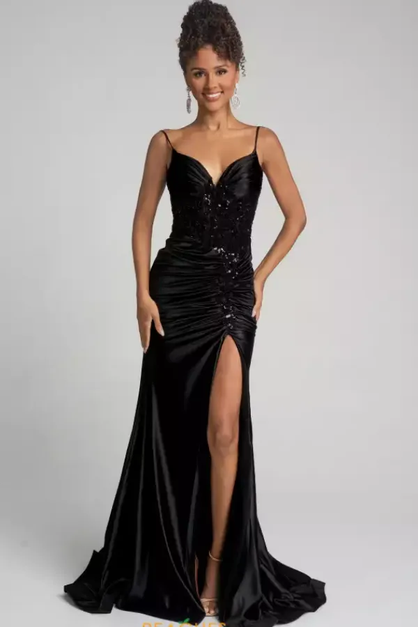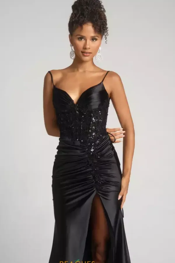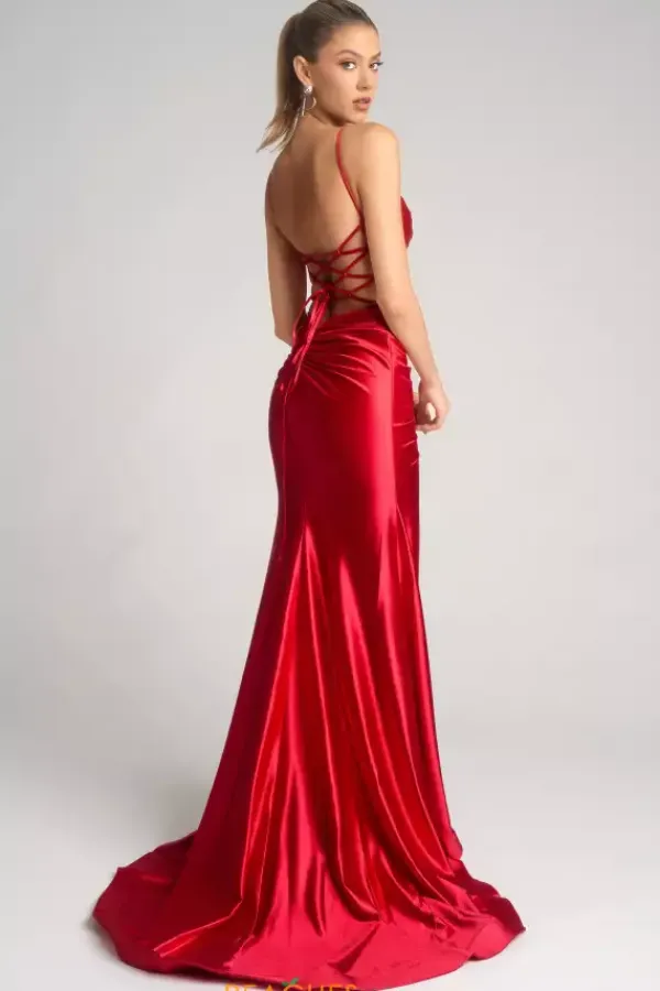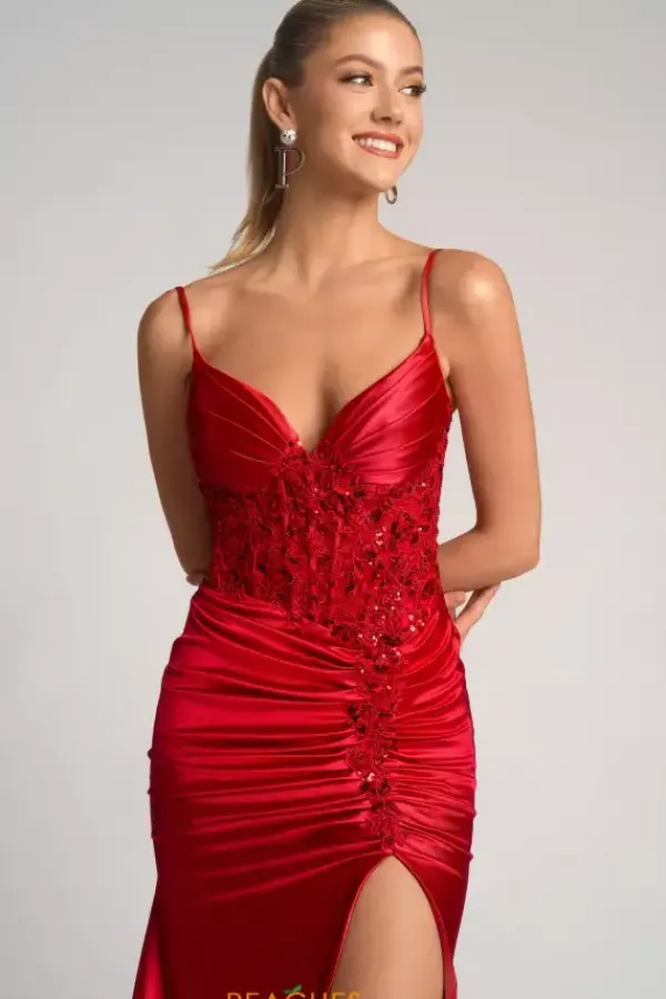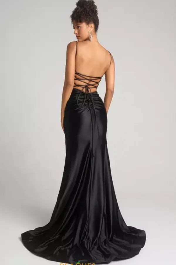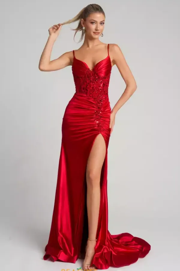 Enter wearing phenomenal long style XO168 by Portia and Scarlett. Featuring the lovely corset lace tie back bodice displaying intricate embellishment of lace applique all over and trails down in a live meeting the start of the thigh high slit. The satin skirt showcasing ruching and a beautiful train to trail behind you.