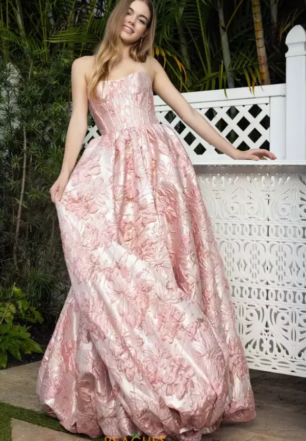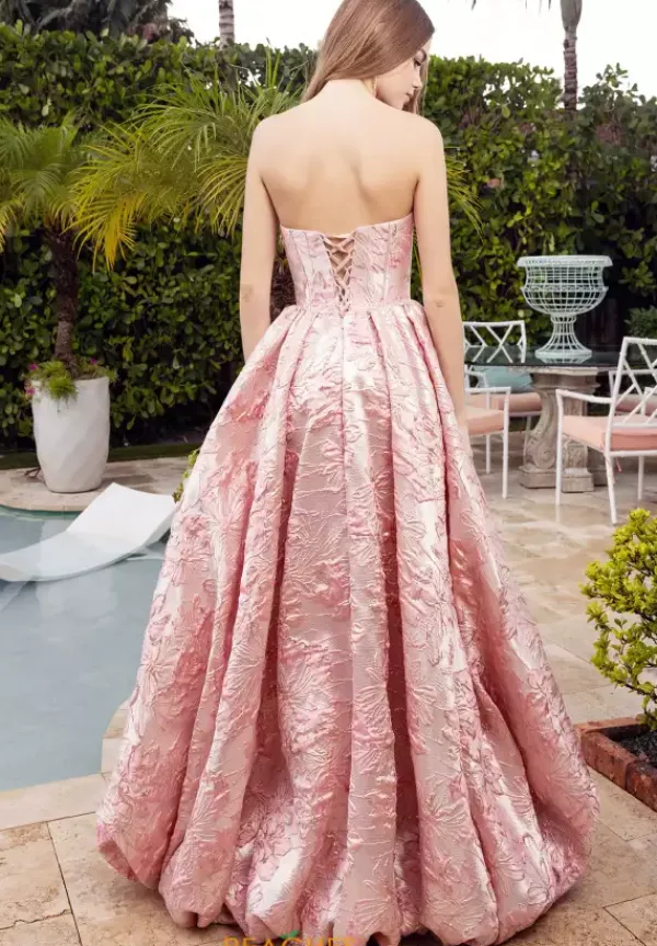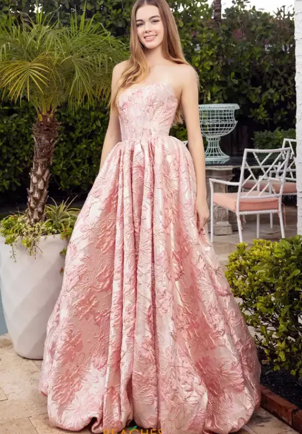 This foil textured Portia and Scarlett a line prom dress style XO180 shines elegantly. The strapless skin tight bodice enhances the small of your waist while the voluminous closed full skirt boasts a metallic shine amongst the foiled floral pattern of the embossed brocade fabric. The unique bubble hem gives this dress its sophisticated finish.